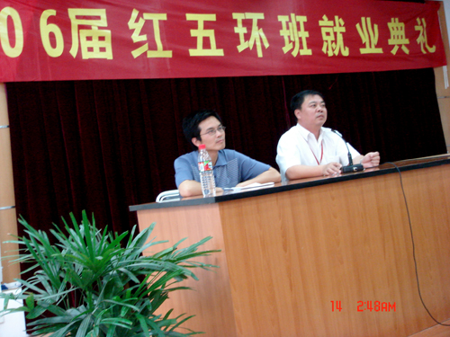 就业典礼上,06届红五环班学员代表向各位同学介绍了在红五环实习的心得体会。公司总经理苏勇强先生对我校长期以来支持红五环班的建设表示感谢,并且向各位在座的同学介绍了公司发展历程,这让广大同学进一步了解了红五环深厚的底蕴及未来的发展前景。