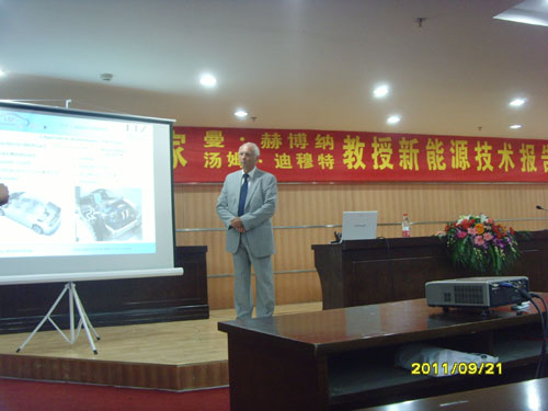 汤姆•迪穆特教授是德国汽车新能源技术领域的专家,主要研究方向是车用大功率高效能蓄电池及其充电系统的开发。报告会上,他介绍了世界电动汽车发展状况、分析了电动汽车的发展环境和德国电动汽车产业的现状,阐述了混合动力汽车、纯电动汽车、燃料电池汽车等大功率电池开发的关键技术及其研发现状。 曼•赫博纳教授主要的研究方向是柔性自动化技术及应用,他以“柔性自动化装备的设计方法和制造技术”为主题,报告了以数控技术为核心的自动化技术发展现状和前景,并展示了汽车自动化生产、检测、控制及装配线上柔性机械手臂工作的相关视频资料。