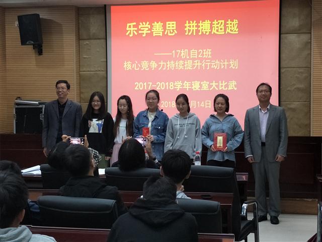 近日,以“乐学善思 拼搏超越”为主题,万象城官网17级机自本2班举行了2017-2018学年寝室大比武现场答辩会。七个寝室的代表从课程学习、英语等级考、课外科创活动等8方面进行汇报,在总结寝室所有同学一学年成果、展现特色的同时,对存在的问题进行分析,并提出具体改进措施。“学院非常注重优良班风学风的养成教育。我们从大一开始就制定了班级的核心竞争力持续提升行动计划和评分细则,个人累计加分后进行寝室的交流评比。在增强凝聚力的同时,也形成了清新清静的学风,让同学们进一步明确了学习目标,沉下心来努力学习。”班主任应振根博士这样说道。