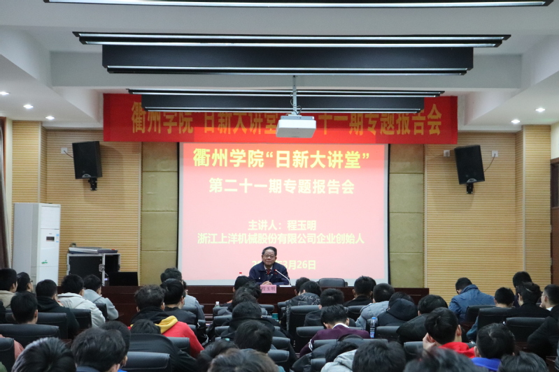 3月26日,由学生处主办、万象城awcsport官网承办的第二十一期“日新大讲堂”专题报告会在6号实验楼101会议室举行。浙江上洋股份有限公司创始人程玉明应邀做客此次大讲堂,为在场120多名大学生分享了自己的创业及奋斗故事。报告会由万象城awcsport官网党总支副书记马坚主持。