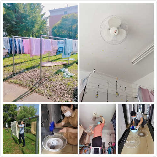 晒被洗风扇,为学生准备一个卫生安全的“家”。开学后,寝室将成为返校学生的主要生活场所,寝室卫生环境的优劣将直接影响学生的身体健康。为防止三个多月无人居住的寝室密闭酝发异味,被褥变潮发霉,滋生细菌,学院分团委及时在线发起“云”端晒被活动,组织辅导员、寝室楼幢值班员为有需求的学生提供开窗通风、晾晒被褥服务,希望学生一入寝,便能闻到阳光的味道。夏日已至,风扇尚挂满灰尘,为解除这一卫生“死角”,学院党总支联合机关第五党支部,组织党员教师对学院全体女生寝室风扇进行了彻底清洗,老师们每两人一组,搬梯登高拆风扇,一刷二洗三安装,认真细致,一气呵成,只为学生在炎炎夏日,感受习习凉风。