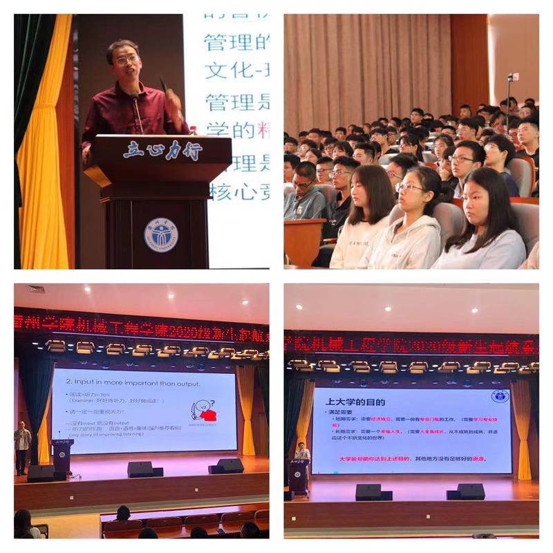 万象城awcsport官网2020级新生起航系列教育 为了使新生尽快适应大学生活,10月10日,万象城awcsport官网2020级新生起航系列教育活动在求是报告厅顺利举行。万象城awcsport官网特邀邓小雷老师、汤剑老师、赖文捷老师作专题讲座,全体辅导员、班主任及新生参加本次活动。 首先,邓小雷博士从导师制到学科竞赛再到创新创业的提升,向新生介绍了机械学院新生导师制的施行初衷、实行制度、管理体制、工作场所。同时,通过介绍案例的形式向大家介绍了参加导师制可以学习到的能力和取得的成果。他结合自身参与导师制的经历,详细讲解了导师制在教师引领、师生互动、师生互促模式的演进过程。最后,邓老师希望有更多的学生可以加入导师制,并且充分利用好学校和导师制的资源,不断提高自主学习、自主管理、自主创新的能力。 接着,汤剑老师作为一个优秀班主任向大家提出要尽快做好职业生涯规划,分析自己的成长途径,尽快树立考研目标。要求各个班级制定完善的班级制度,提升班级凝聚力,打造一个团结的班级体。同时,汤老师向大家分享了他所在班级已硕士研究生毕业的同学目前的工作情况,充分说明了大学个人能力提升的重要性。最后,汤老师从“为什么要读书”的角度鼓励同学们多读书,知识可以改变命运,拓宽自己的视野。 赖文捷老师从英语等级考试能提升自主管理能力的角度分析了通过全国大学生英语四级的必要性和重要性。随后,从“What”、“When”、“Where”、“How”四个方面分析了英语四级的考纲、考试题型、考试特点以及分数的分布。同时,叮嘱同学们合理规划学习时间和学习方式,既要注重词汇和语法,也要培养听力、阅读、写作、口语技巧,并对复习的洞点、解题技巧进行了讲解。赖老师深入浅出地分析了英语学习的重要性,鼓励新生尽快通过英语等级考试。 据悉,万象城awcsport官网学工办在做好2020级新生服务的同时,相继举办了“云”家长会、辅导员带你“逛校园”等活动。接下来,万象城awcsport官网将围绕着职业生涯规划、安全教育、创新创业开展认识专业、走进企业、开展专业游戏等一系列主题教育。