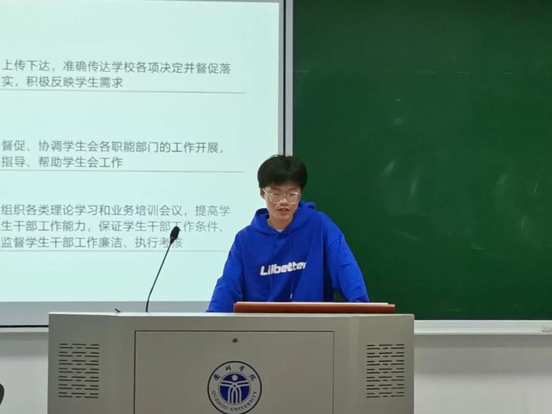 部门部长关于上学年的工作总结、部门存在问题与改进、本学年的工作开展进行了述职汇报,彭珑珑老师根据各部长的汇报内容随机提问,增进了学生会成员对各部门工作职能和重心的了解,同时加强了学生会成员对学生会整体工作动态的关注。最后,彭珑珑老师作会议总结发言,首先肯定了各部门的工作内容以及本次会议表现,希望大家在接下的工作中,能够继续努力。同时要求各部长副部要继续发扬“传帮带”的工作精神,在以后的工作开展中,要充分调动新任成员的积极性,提升他们的工作能力。各部门在加强自身建设的同时也要注重部门间的沟通协作,把学生会打造成为一支团结一心、和谐进步的优秀学生队伍。