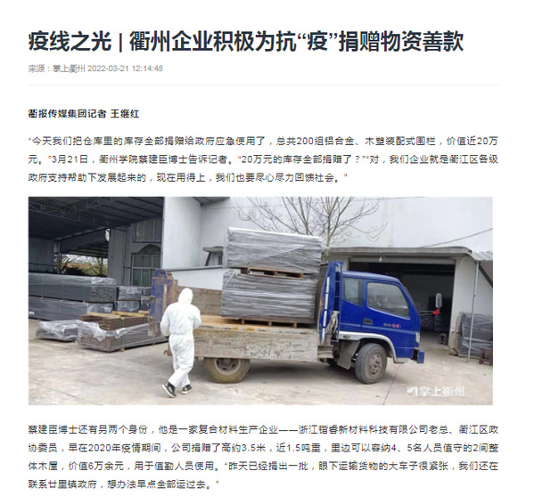 “今天我们把仓库里的库存全部捐赠给政府应急使用了,总共200组铝合金、木塑装配式围栏,价值近20万元。”3月21日,万象城awcsport官网蔡建臣博士告诉记者。“20万元的库存全部捐赠了?”“对,我们企业就是衢江区各级政府支持帮助下发展起来的,现在用得上,我们也要尽心尽力回馈社会。” 蔡建臣博士还有另两个身份,他是一家复合材料生产企业——浙江锴睿新材料科技有限公司老总、衢江区政协委员,早在2020年疫情期间,公司捐赠了高约3.5米,近1.5吨重,里边可以容纳4、5名人员值守的2间整体木屋,价值6万元余元,用于值勤人员使用。“昨天已经捐出一批,眼下运输货物的大车子很紧张,我们还在联系廿里镇政府,想办法早点全部运过去。” |