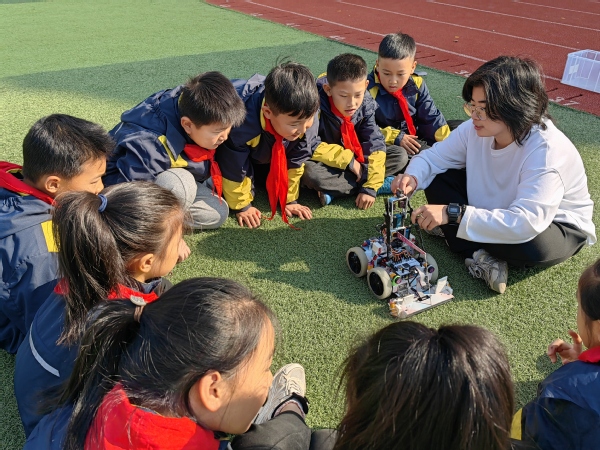 “教育、科技、人才是全面建设社会主义现代化国家的基础性、战略性支撑。科技是第一生产力、人才是第一资源、创新是第一动力,所以同学们,大家要多思考,培养创新精神和创造力,将来要比机器人‘聪明’哦。”李婕宁同学在宣讲中说。 本次活动相关负责人表示,本次沉浸式的宣讲,一方面结合机械学院专业背景,讲好党的二十大精神。另一方面,以大手拉小手的形式,让党代会的精神在孩子们心里生根发芽。 |